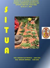 Vol. 23 Núm. 1 (2020)La Revista SITUA, órgano de difusión científica de la Facultad de Ciencias de la Salud de la Universidad Nacional San Antonio Abad del Cusco Perú , cuyo primer número salido el año 1993 nació como respuesta a la necesidad de docentes y alumnos de difundir sus ideas, experiencias, planteamientos y discusión alternativas de nuestros problemas regionales de salud. Incluye escuelas profesionales de Medicina Humana , Enfermería , Odontología , Obstetricia , Farmacia y Bioquímica . Actualizando su reglamento a la normatividad internacional y dando nueva estructura organizativa. La publiacion de articulos cientificos, se enmarcan dentro del conocimiento libre y como aporte valioso de la UNSAAC a la activdad académica y de investigacion en nuestra region y pais.